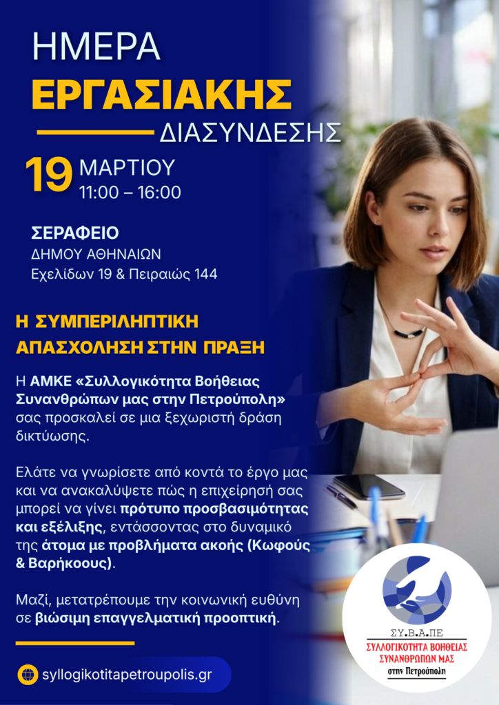 Σας προσκαλούμε στην «Ημέρα Εργασιακής Διασύνδεσης» που συμμετέχει η ΑΜΚΕ «Συλλογικότητα Βοήθειας Συνανθρώπων μας στην Πετρούπολη» την Τρίτη 19 Μαρτίου στο Σεράφειο του Δήμου Αθηναίων.